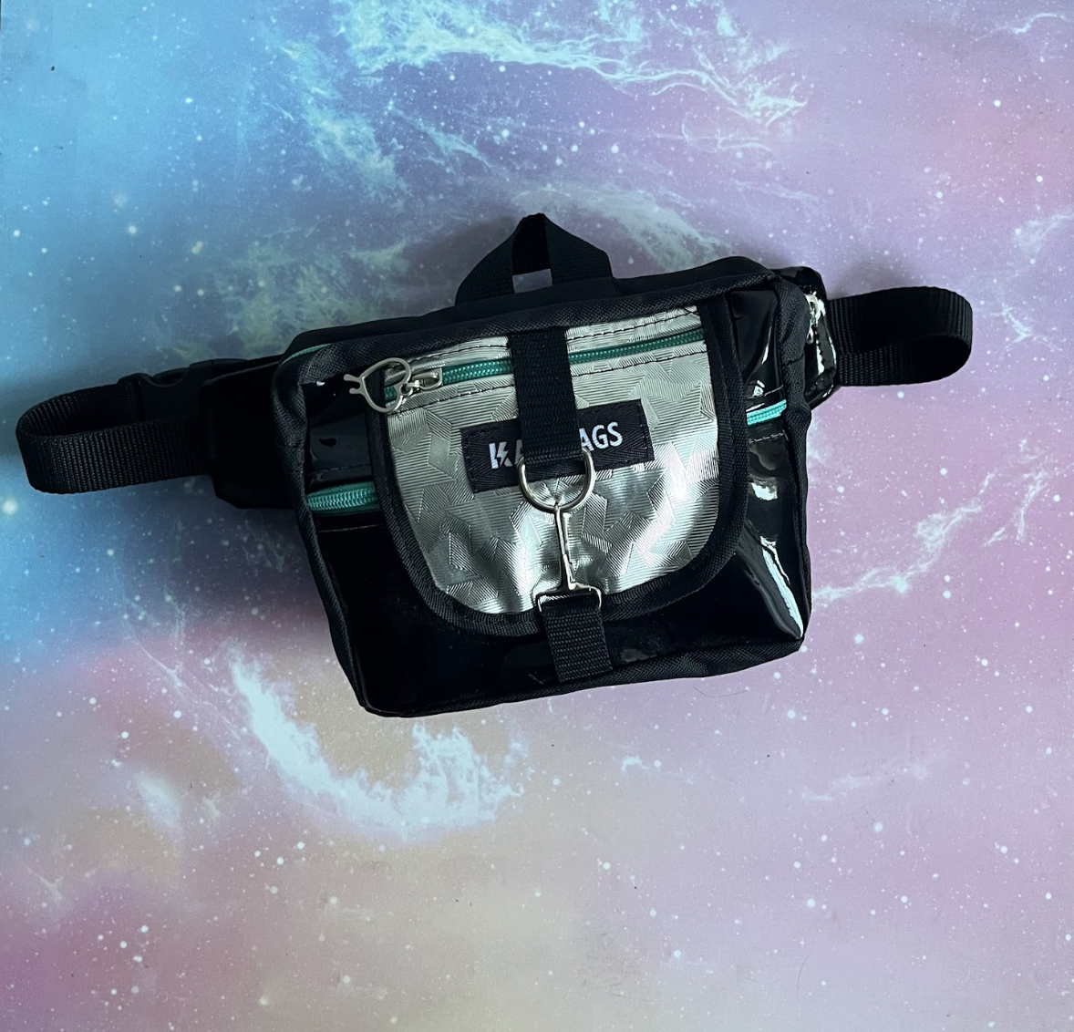 Banano confeccionado en charol, con bolsillo delantero, tapa con bolsillo y bolsillo principal.