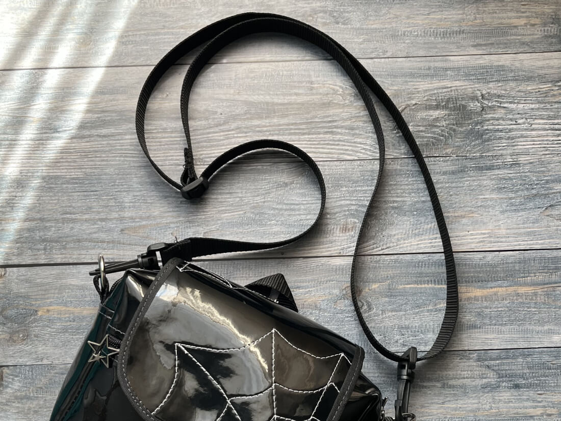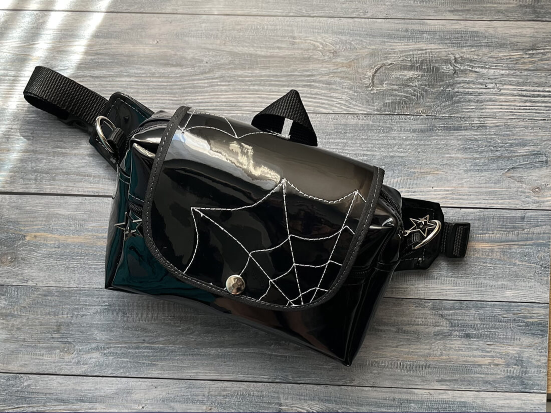 Un accesorio que impone presencia. Hecho a mano con charol negro brillante y costuras en forma de telaraña, este banano combina diseño atrevido con funcionalidad.